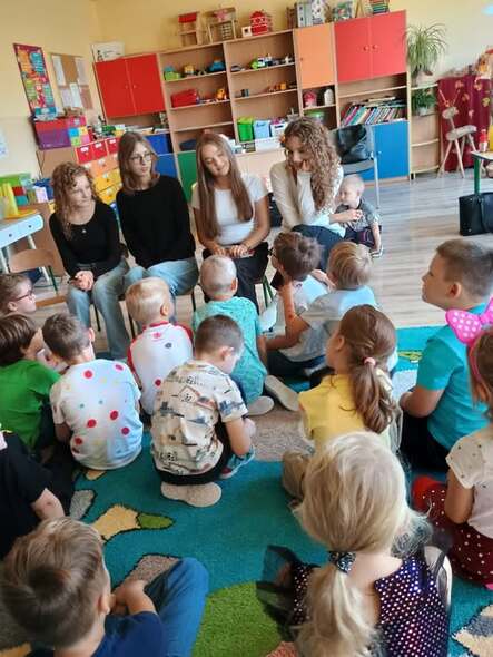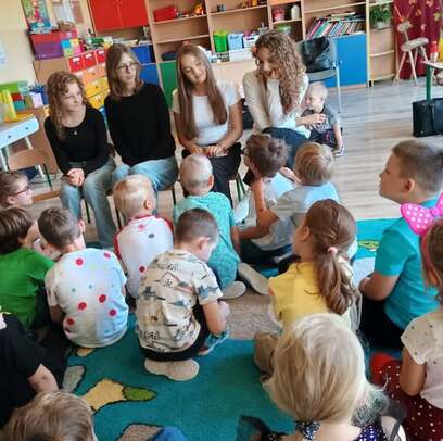 Maczek czyta przedszkolakom Wspierając akcję "Dzień Głośnego Czytania" w Przedszkolu nr 20 w Katowicach, wolontariuszki z klasy 4e i 3c czytały dzieciom bajki.