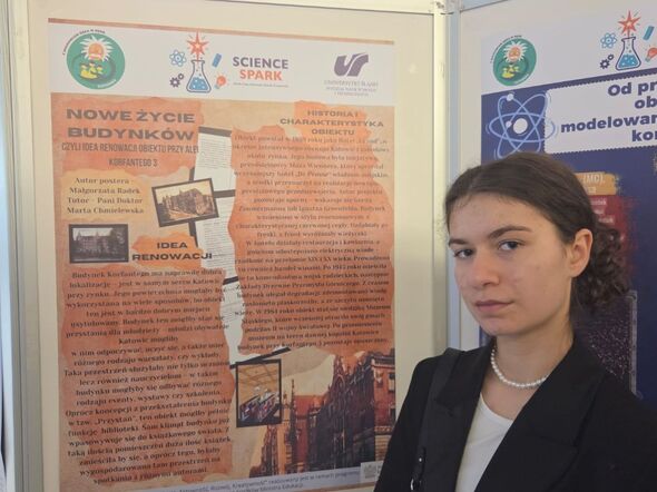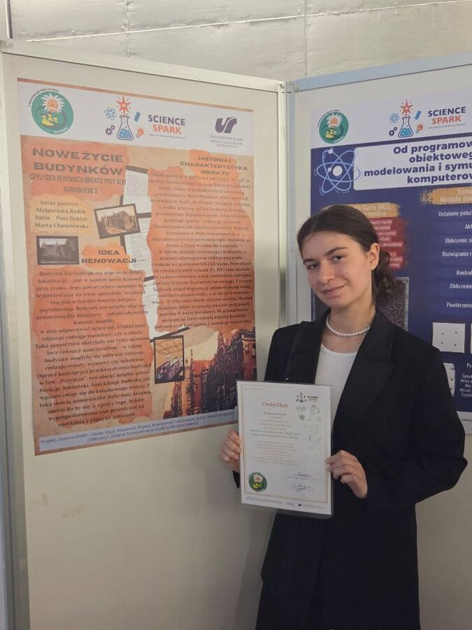 Uczennica naszej szkoły Małgorzata Radek z klasy 2f architektonicznej wzięła udział w projekcie tutoringowym „Z naukowcem ręka w rękę”. Projekt realizowany pod patronatem Uniwersytetu Śląskiego miał na celu podniesienie kompetencji w zakresie indywidualnej pracy w relacji Uczeń-Mistrz. Gosia realizowała temat „Rewitalizacja, czyli jak dać ‘drugie życie’ zdegradowanej przestrzeni w mieście”. W ramach projektu miała okazję pogłębić wiedzę na temat procesów rewitalizacyjnych oraz znaczenia świadomego kształtowania przestrzeni miejskiej. Udział w przedsięwzięciu pozwolił jej rozwinąć umiejętności analityczne i badawcze oraz poszerzyć zainteresowania związane z architekturą i urbanistyką.